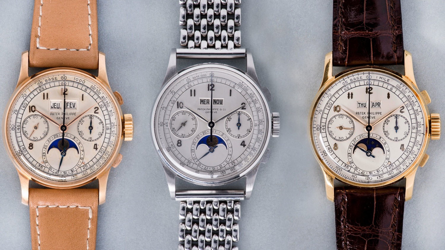 This, folks, is horological madness. A few weeks ago I showed you four Patek Philippe 5970s, one in each metal, all together, but now I think I can up the ante. We have learned from a source at Phillips that the Geneva Watch Auction: Four sale taking place in November will include three, yes three, Patek Philippe 1518s, one each in yellow gold, rose gold, and stainless steel. This is the first time every case metal of the 1518 has been available in a single auction. We broke news of the steel 1518 hitting the block back in July, but we didn’t know it would be accompanied in the catalog by two of its 280 sisters. Here are all the details about these three absolute mega watches.