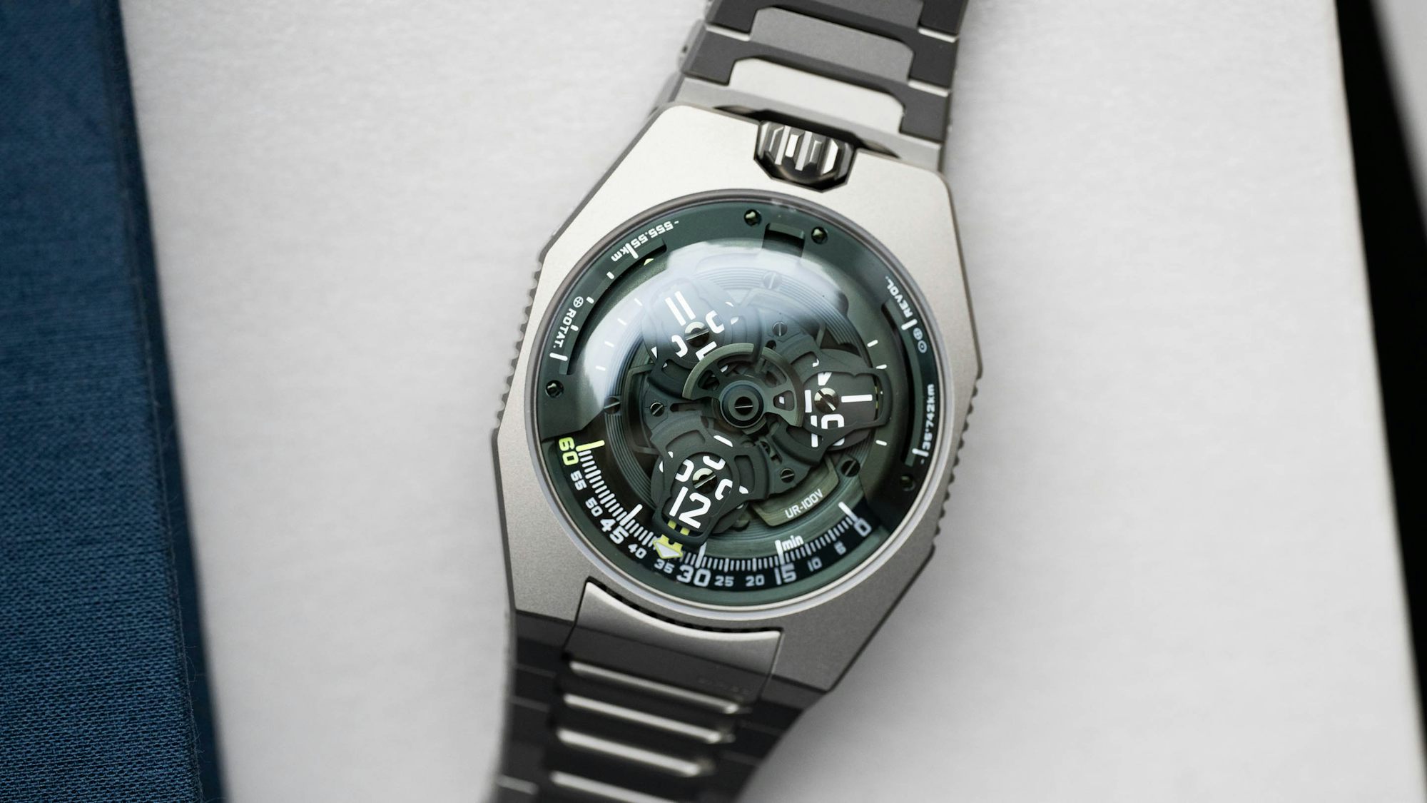 A limited edition colorway for Urwerk’s signature wandering hours complication.