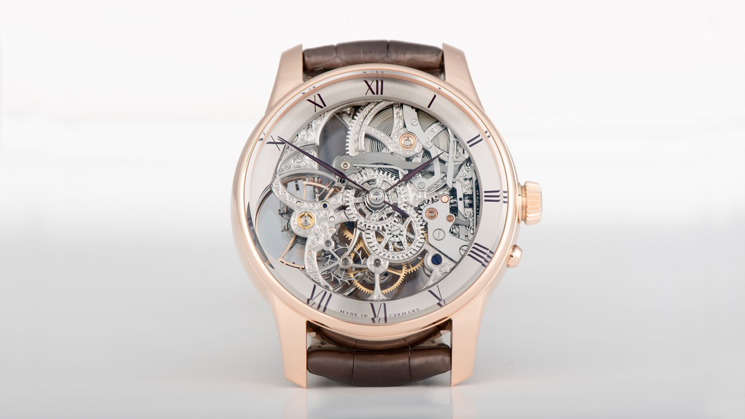 For its first skeleton wristwatch, Moritz Grossmann asked a man by the name of Christophe Schaffo, an independent German horologist and specialist in the art of engraving and skeletonizing, to put one of its hand-wound movements, the caliber 100.5, through a drastic weight reduction program. The result is the highly ornate and slightly eccentric Atum Skelett.